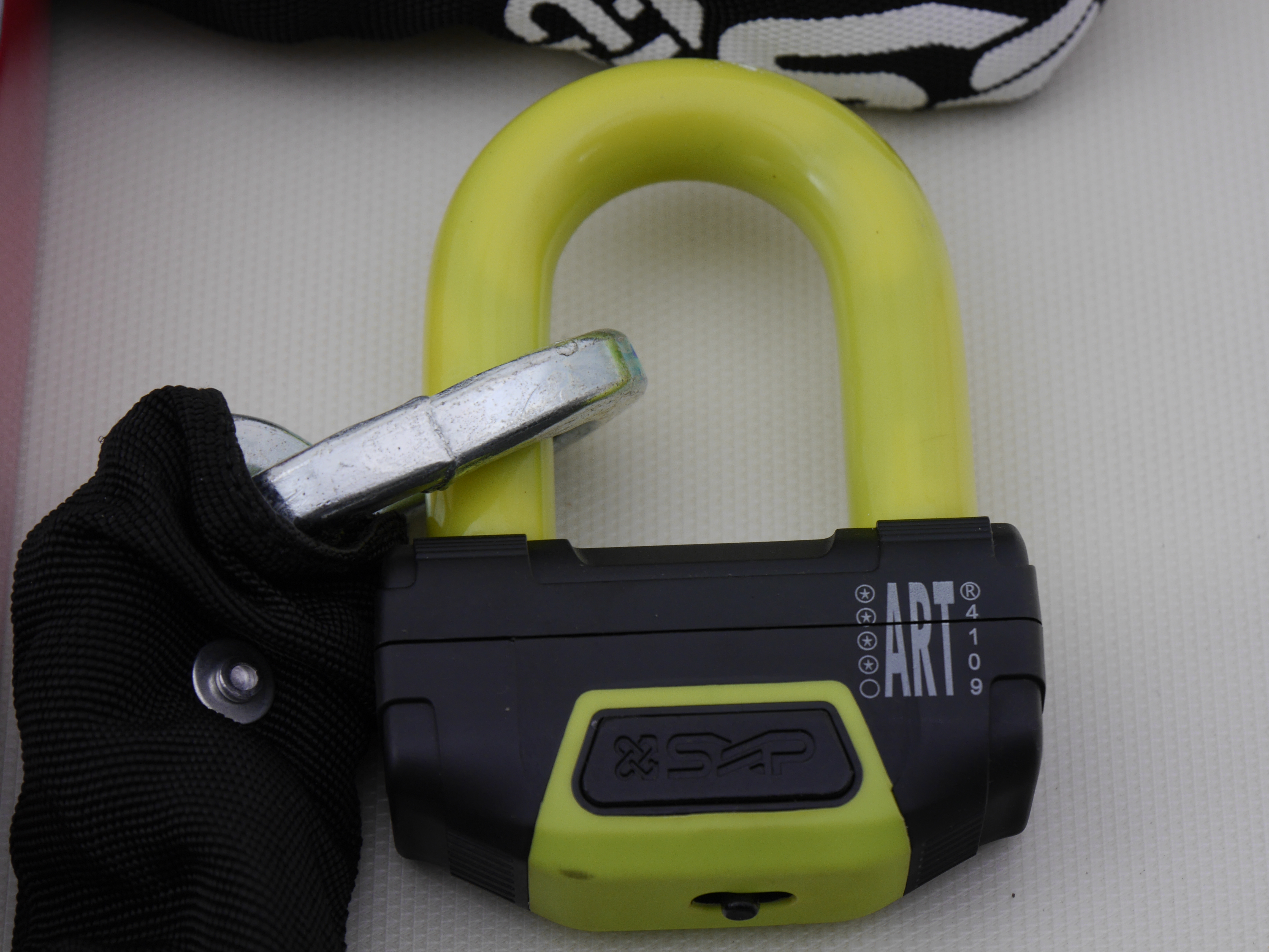 ART 4 goedgekeurd kettingslot met schijfremslot. Ketting van gehard staat, dikte 10.5 mm.